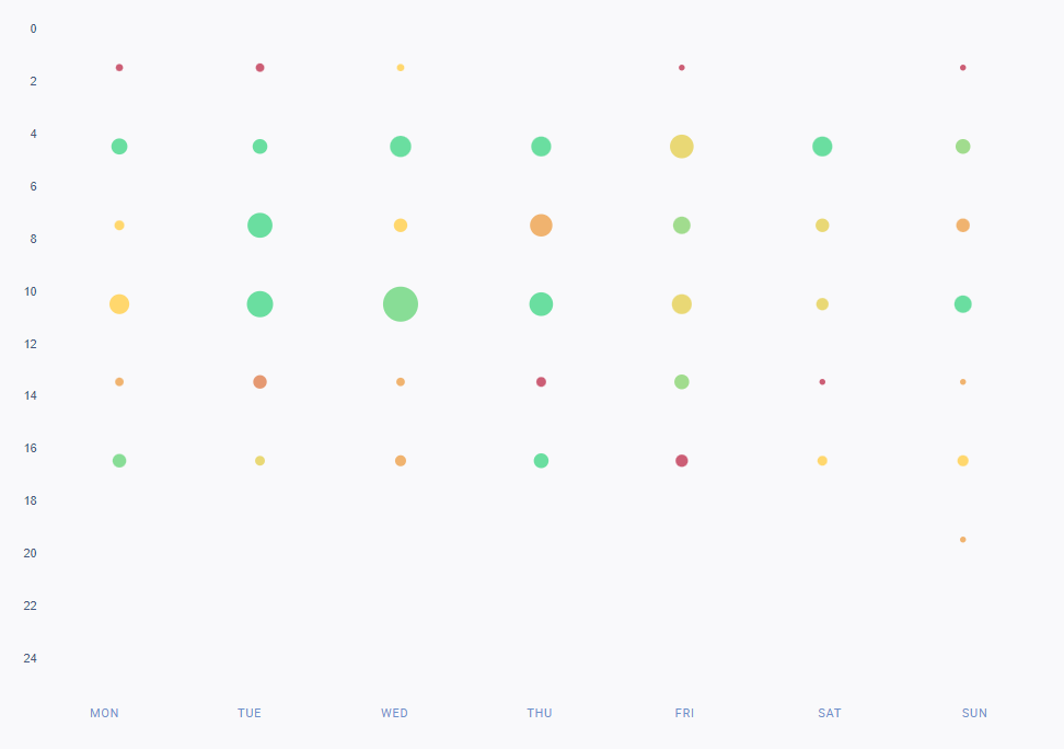 Below is an example of a best time to post chart generated by Fanpage Karma. The data output is for May 2024 and comes from an analysis of the automobile manufacturing profiles we mentioned above when discussing keyword research. Large circles means more posts were posted during a particular timeframe while green circles means that there are higher average post interaction rates at those times (times are for the Central Timezone).