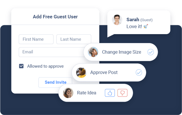 Bleibe mit Projektmanagement-Features organisiert, brainstorme und stimme über Ideen ab. Lade unbegrenzt kostenlose Gastnutzer zur Zusammenarbeit ein. Optimiere Workflows und Arbeitsabläufe mit klaren Freigabeprozessen und behalte so jederzeit den Überblick.