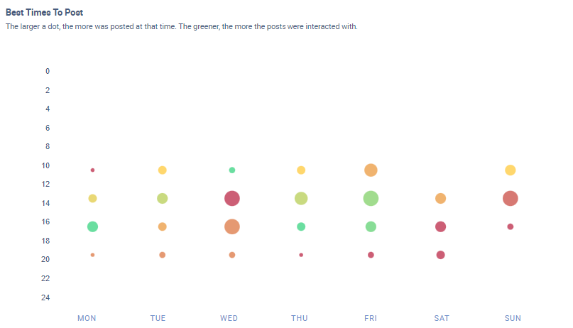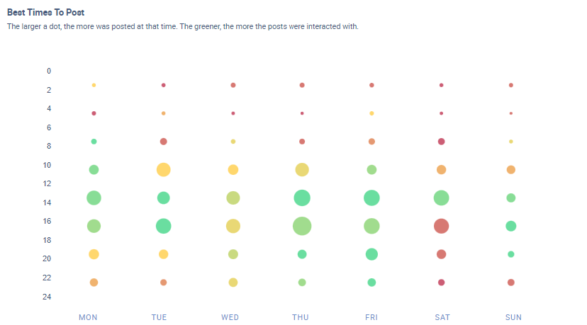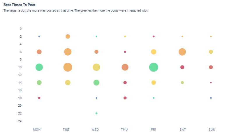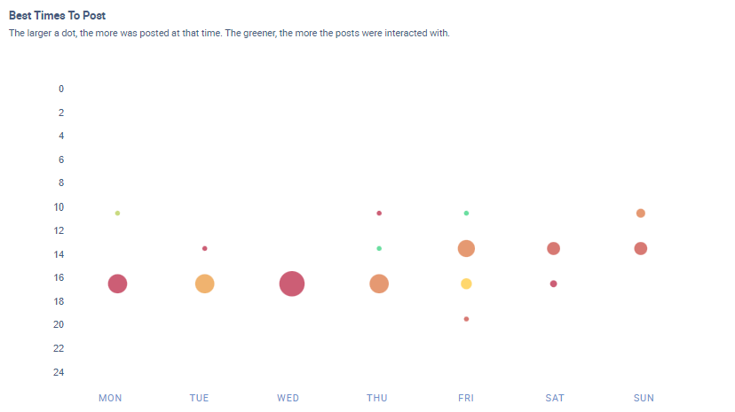 Die Kreise auf der Grafik variieren in Größe und Farbe. Ein größerer Kreis bedeutet eine höhere Anzahl von Beiträgen. Ein grüner Kreis zeigt eine höhere Interaktionsrate pro Fan zu dieser Zeit an. Du kannst innerhalb des Tools verschiedene Zeiträume auswählen (z. B. die letzte Woche, die letzten drei Monate usw.) und Kanäle oder Marken hinzufügen, die wir in die Analyse mit einschließen können.