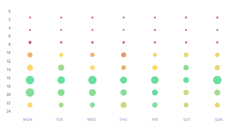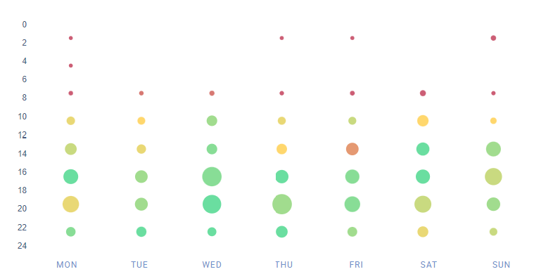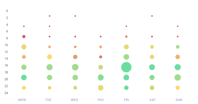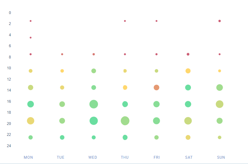 Oben sehen wir eine Reihe von grünen Punkten (was bedeutet, dass diese Zeiten mit relativ hohen Post-Interaktionsraten korrelieren) über die ganze Woche und zu verschiedenen Tageszeiten. Wann ist also der beste Zeitpunkt, um in diesem Fall auf Pinterest zu posten? Du siehst, dass die folgenden Zeiten gut passen würden: