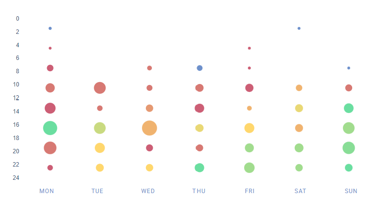 Betrachten wir als Beispiel die Unterschiede zwischen zwei Monaten: Juli 2023 und Dezember 2023. Die Diagramme unten zeigen die Daten aus unserer Analyse der oben genannten Profile für diese Monate. Grüne Kreise bedeuten, dass diese Zeiträume mit einer höheren Post-Interaktionsrate korrelieren. Die Größe des Kreises gibt an, wie viele Beiträge in einem bestimmten Zeitraum veröffentlicht wurden.