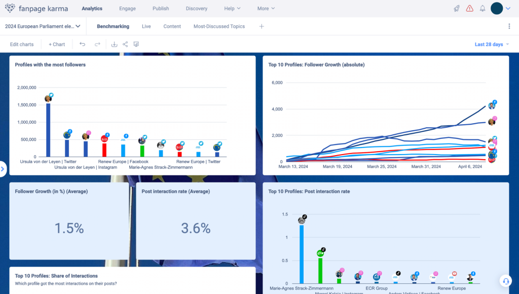 Das Dashboard zeigt neben aktueller Follower-Zahlen, Follower-Wachstum und Engagement Rates auch die am besten performenden Beiträge auf den verschiedenen Plattformen, um ein differenziertes Bild der aktuellen politischen Landschaft Europas zu zeichnen.
