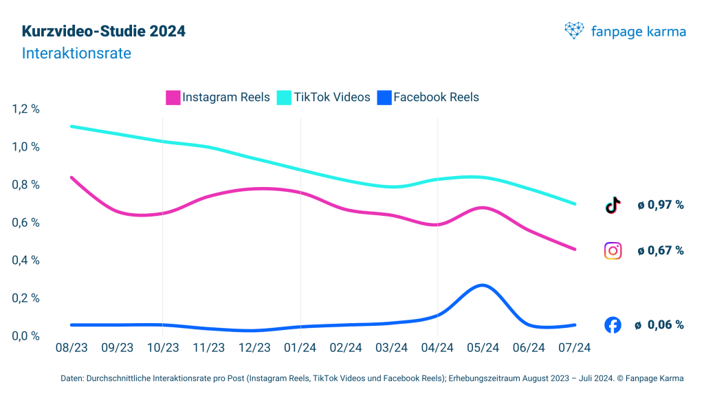 Auf TikTok generierten die untersuchten Videos die meisten Likes, Kommentare und Shares. Die Interaktionsrate auf TikTok sinkt zwar im Laufe des Untersuchungszeitraums kontinuierlich von ø 1,11 % auf ø 0,70 %, liegt jedoch im Jahresmittel bei knapp unter 1 %. Damit ist das Engagement auf TikTok am höchsten unter allen untersuchten Kurzvideo-Plattformen.