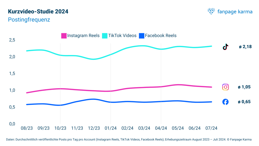 Die Postingfrequenz – also wie oft pro Tag die einzelnen Accounts durchschnittlich neue Videos veröffentlicht haben – blieb auf allen drei Plattformen im gesamten Untersuchungszeitraum relativ stabil und zeigte keine großen Veränderungen. Keines der drei Netzwerke hat folglich im letzten Jahr nennenswert an Relevanz gewonnen oder verloren.