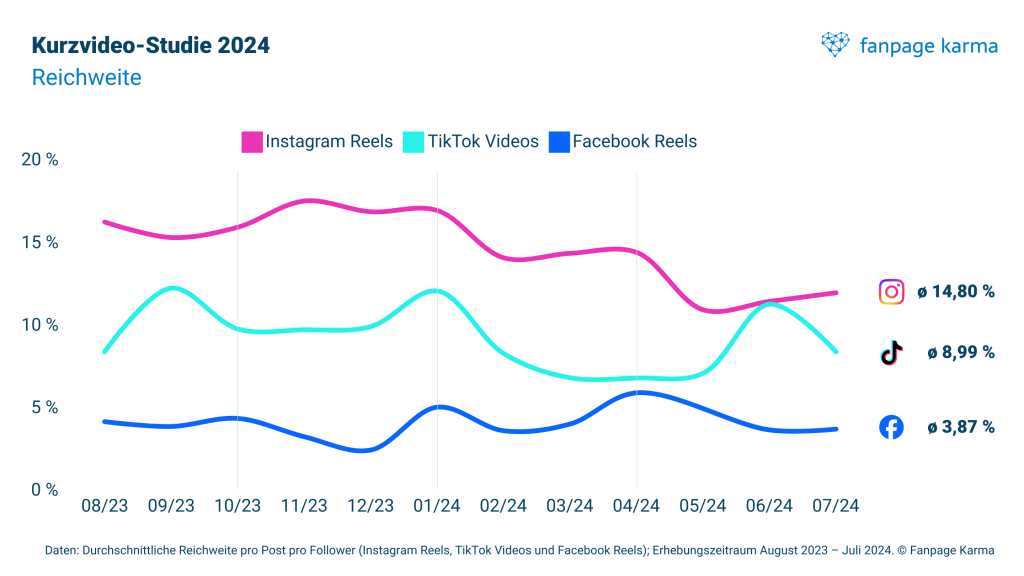 Die Reichweitenunterschiede zwischen den einzelnen Plattformen könnten kaum größer sein. Instagram Reels gehen als klarer Sieger aus dem Vergleich hervor: Obwohl die Reichweite der Kurzvideos kontinuierlich abnimmt und vor allem in den Sommermonaten 2024 ein leichter Einbruch zu verzeichnen ist, konnten die untersuchten Accounts mit einem Reel durchschnittlich fast 15 % ihrer Follower erreichen.
