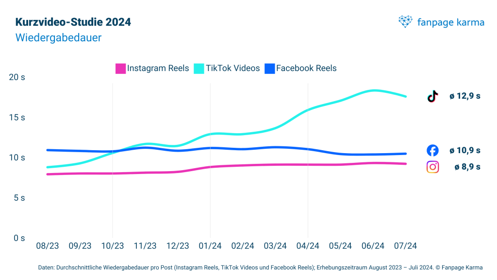 TikTok-Videos verzeichneten über den gesamten Untersuchungszeitraum hinweg eine steigende Wiedergabedauer. Sie erhöhte sich zwischen August 2023 und Juli 2024 stetig von 8,77 auf 17,56 Sekunden (Jahresdurchschnitt ø 12,9 Sekunden). Auch wenn die Nutzer zunehmend weniger mit den Videos interagierten, hat der gepostete Content scheinbar ihr Interesse geweckt.