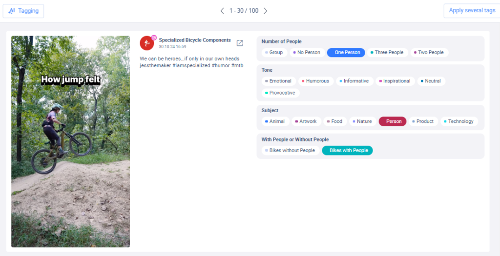 Natürlich kann man argumentieren, dass der Datensatz, den wir in unserem Beispiel verwendet haben, relativ klein ist. Das stimmt. Je größer der Datensatz und je mehr Datenpunkte du analysierst, desto mehr Vertrauen kannst du in die Genauigkeit und Relevanz deiner Ergebnisse setzen. Wenn du Fanpage Karma verwendest, kannst du mit der KI-Tagging-Funktion Beiträge automatisch taggen, sodass du problemlos Hunderte von Beiträgen zu deinem Datensatz hinzufügen kannst. Wie im Beispiel hervorgehoben, kannst du auch mehrere Tags auf einmal anwenden, siehe Beispiel unten.