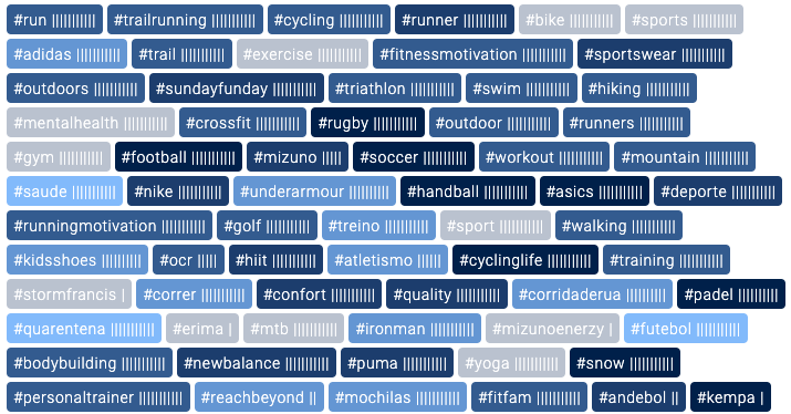 In dem Beispiel oben siehst du die Top-Hashtags von 15 Sportmarken. Die Größe der Hashtags zeigt an, wie häufig sie zwischen Juli und Dezember 2023 verwendet wurden. Je grüner die Hashtags sind, desto höher war die Interaktionsrate mit diesen Posts. Mit einem Klick auf den Hashtag kannst du dir alle Instagram Posts anzeigen lassen, die den jeweiligen Hashtag beinhalten.