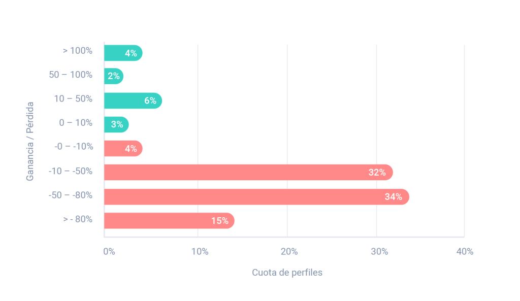De los 1.000 perfiles analizados, un pequeño número ha podido contrarrestar la tendencia: el 15 % de las cuentas han ganado más visitas en los dos últimos años. En su mayoría, los aumentos son inferiores al 50 %. Sin embargo, la clara mayoría del 85% de los usuarios de nuestro estudio registró una pérdida de alcance. En algunos casos, la disminución es enorme: la mayoría de los perdedores sufrieron pérdidas de entre el 50 % y el 80 %.