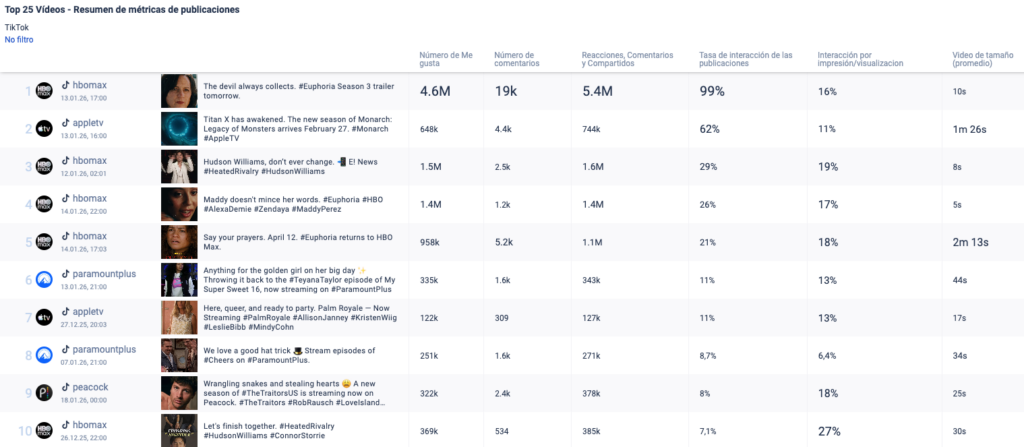 - HBO Max alcanza el mayor promedio de «Likes» por publicación con la duración media más corta de los vídeos