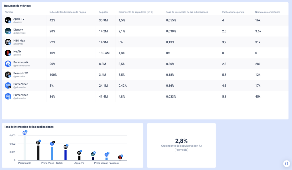Para demostrar cómo realizar un análisis de la competencia en las redes sociales, utilizaremos un caso práctico real en el que se analizan las principales marcas de streaming, como Amazon Prime, Apple TV, Disney+, HBO Max, Netflix, Paramount+ y Peacock. Compararemos su rendimiento en las redes sociales, explicaremos qué es lo que impulsa los mejores resultados y destacaremos las oportunidades de mejora en todas las plataformas.