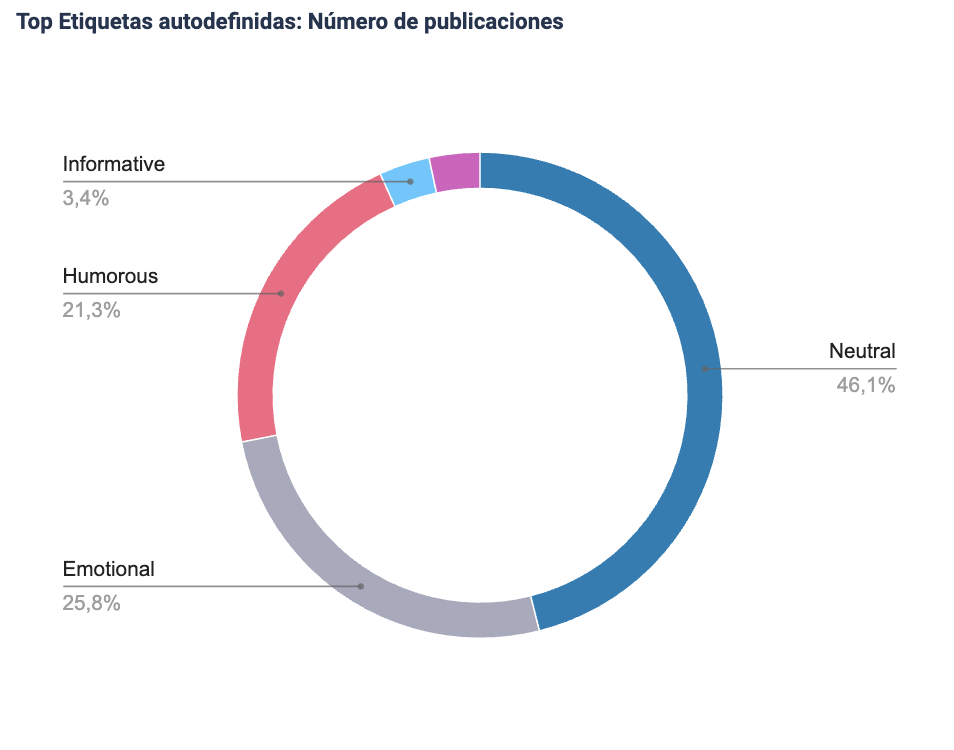 Para comprenderlo mejor, veamos cómo funciona en la práctica un análisis de etiquetado. En el ejemplo siguiente, hemos etiquetado las publicaciones de Instagram de los perfiles rastreados según su tono: informativo, humorístico, emocional, neutro, inspirador y provocador.