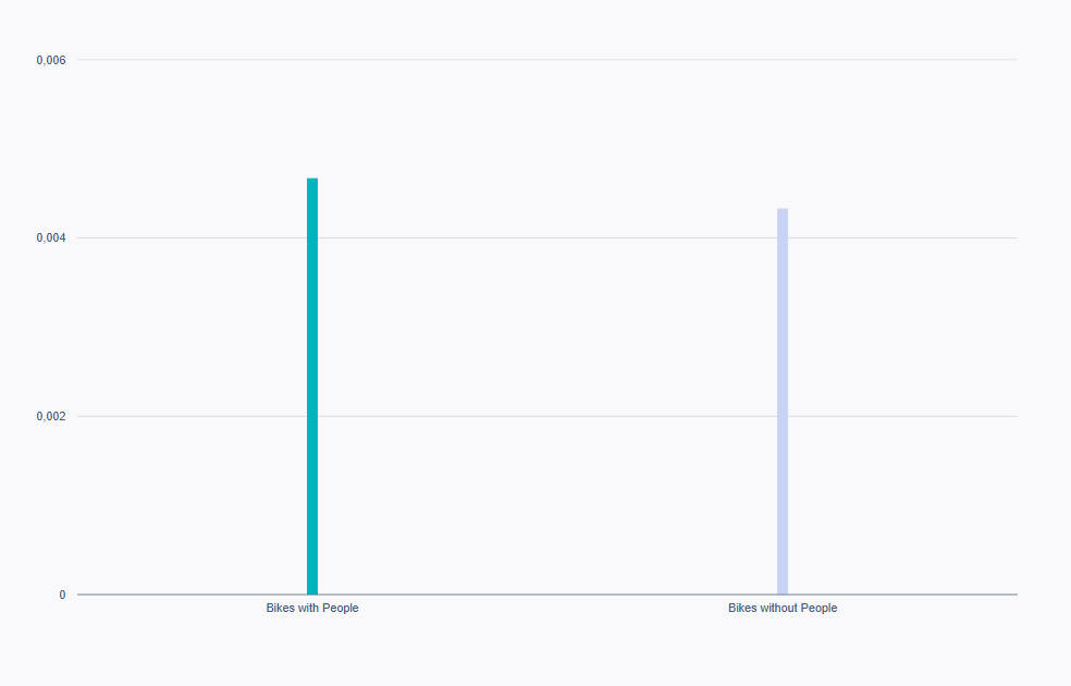 Para recopilar algunos datos y realizar un análisis, etiquetamos un total de 20 publicaciones, asignándoles una de las dos etiquetas para mantener el equilibrio. Como puedes ver a continuación, nuestros resultados muestran que las imágenes de “Bicicletas con gente” tienen, en promedio, una tasa de interacción ligeramente superior a las de “Bicicletas sin gente”.