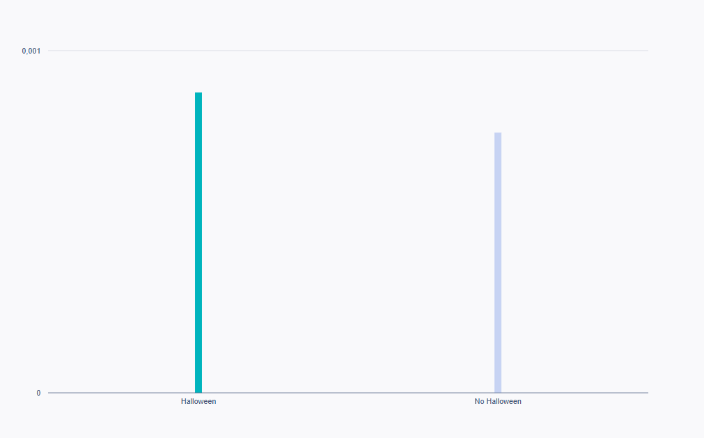 De forma similar al primer ejemplo, etiquetamos 20 posts que correspondían a cada etiqueta de categoría. Como podemos ver a continuación, los contenidos que se relacionan con Halloween tienen una tasa media de interacción de publicaciones más alta que los que no lo hacen.