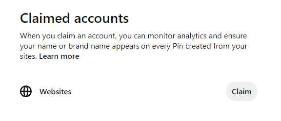 The menu item “Claim” can be found in the settings. Here, you can verify your website which you can link it to your business profile. This way, your name and profile picture will be displayed next to pins which helps with the recognition of brand or company.
