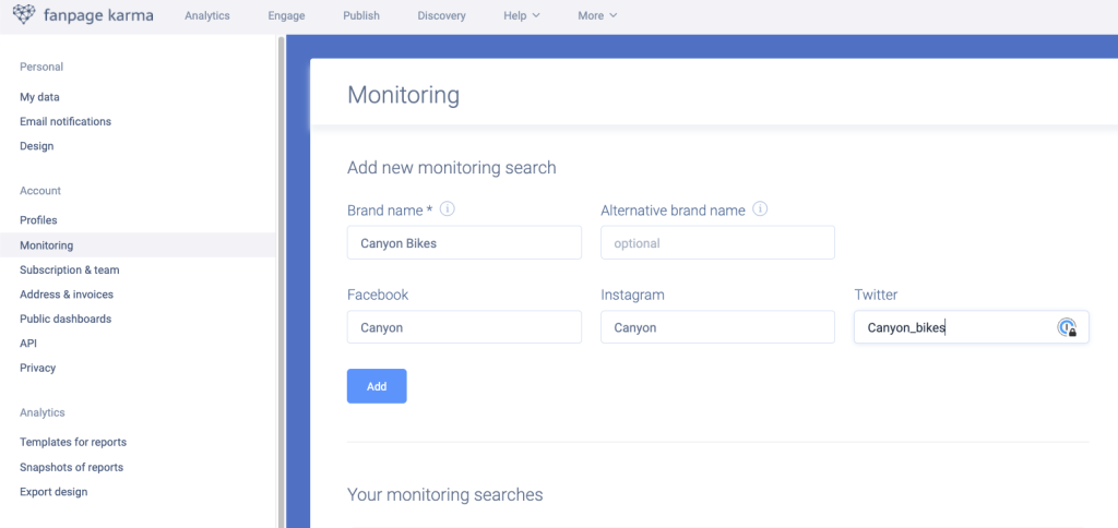 To access the monitoring section of Fanpage Karma, you must have at least the Gold plan and purchase a monitoring plans S, M or L. You can review our pricing and plans here: https://www.fanpagekarma.com/plans.