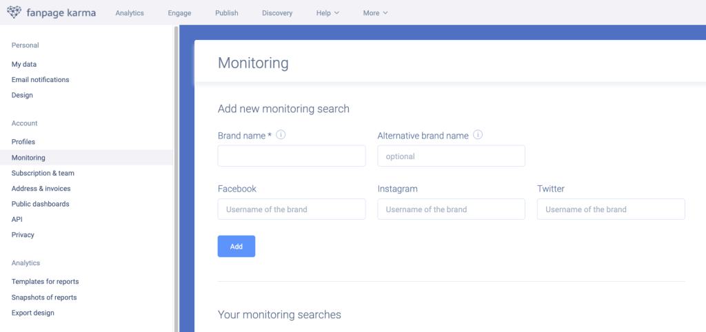 To access the monitoring section of Fanpage Karma, you must have at least the Gold plan and purchase a monitoring plans S, M or L. You can review our pricing and plans here: https://www.fanpagekarma.com/plans.
