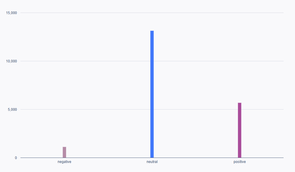 In the last several examples, we have looked at metrics on a profile basis. But perhaps you want to look further into the share of positive, negative, and neutral comments are for all social media profiles in your data set on a particular social media network. In order to better illustrate this, let’s say we wanted to conduct an Instagram sentiment analysis related to the the posts that NFL teams are making. In this case, we will not focus on the sentiment associated with the posts or comments on a specific team’s profile, but rather bring together all of the data and look at whether a social media network, in this case Instagram, trends toward positive, neutral, or negative. As you can see below for our Instagram sentiment analysis, the vast majority of posts from these teams are either neutral or positive in sentiment.