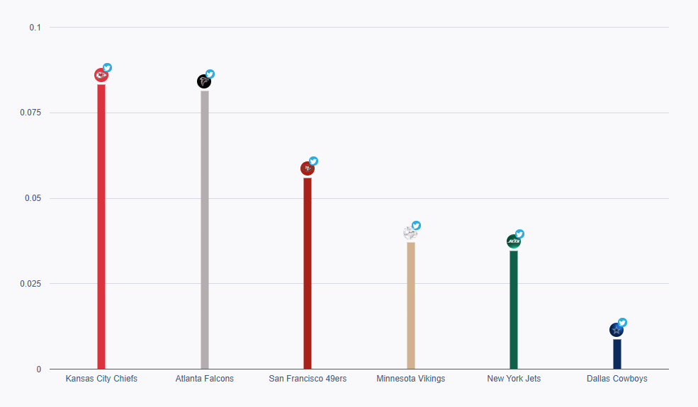 Interestingly, as shown below, Kansas City has the highest share of negative Tweets in this period even though it also has the highest share of positive Tweets as well. The Dallas Cowboys have the lowest share of negative Tweets related to its profile.