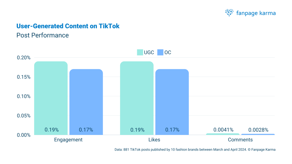 When it comes to comments, the difference is much more pronounced. User-generated content received almost 1.5 times as many comments as the brands’ original content. However, TikTok users tend to comment rather sparsely overall. Only 0.0041% of followers left a comment on UGC, while 0.0028% commented on the fashion brands’ own content.