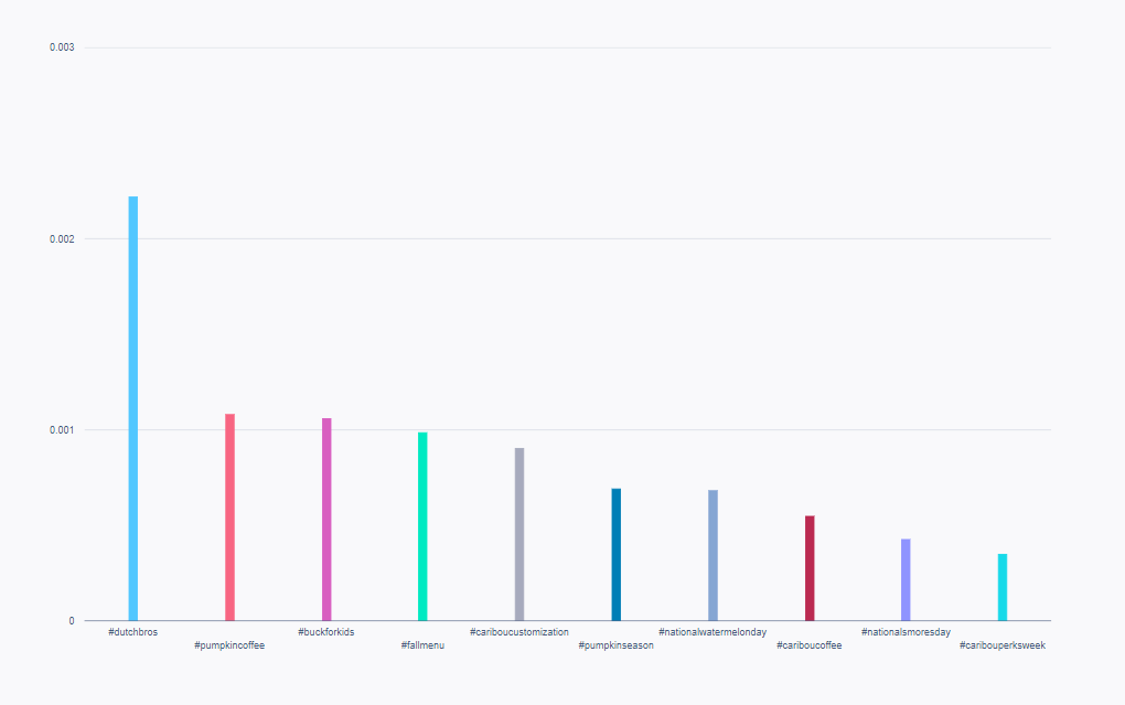 As shown above, this bar chart shows highly performing Facebook hashtag trends for a particular time period in the coffee shop chain industry (in this case July 2023). Of course, when studying the results above, you would look first at the non-branded hashtags on this list since branded hashtags associated with a particular coffee shop chain will also appear in your results. However, the main question relating to our example here is if December (a.k.a. the Christmas season) has a real effect on the top hashtags in terms of post-interaction rate? After studying this bar chart, we can say that some of the best Facebook hashtags to use would be: