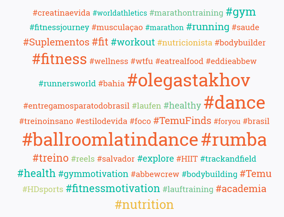 You see some similarities when comparing this word chart to the one from July 2023. However, as you can clearly see, there are some noticeable differences. In this case, you should be aware the best gym and fitness hashtags for Instagram may be dependent on the seasons or months, so this type of analysis can help you pinpoint what hashtags are best to use when.