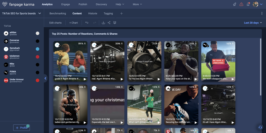 You can, of course, use social media analytics tools to help you discover the TikToks your target audience interacts with the most. As you can see in the example below, with a social media tool you can select TikTok profiles that you want to analyze and learn from, and then see their best and worst performing posts as well as other relevant information